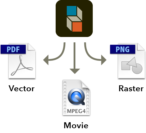 In addition to static images, your scripts can easily generate multi-frame animations. Movies can be exported as H.264-encoded QuickTimes, animated GIFs, and even PDF ‘flipbooks’.